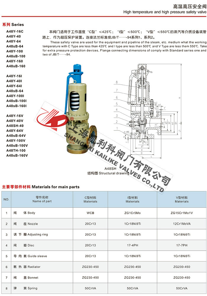 聲明:【A44Y,A48Y彈簧式安全閥】規格型號、結構尺寸由上海凱利科閥門有限公司提供,如何選擇適用的A44Y,A48Y彈簧式安全閥產品,使之在工藝控制中安全可靠、經濟適用,可致電我司銷售部門及技術部門,我們將在最短的時間內為您解答!